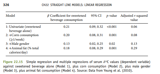 Researchers suggested that the value of the carbon isotope δ13C in human serum might reflect dietary consumption of corn‐based and cane‐based sweeteners. This might then offer a measure that objectively reflects intake of sweets and could thus replace unreliable self‐reported dietary assessments. They investigated this possibility among a sample of 186 participants by using a linear regression model with the level of δ13C in serum as the outcome variable and the level of the consumption of sweetened drinks (estimated number of cans consumed per day) as the covariate. They then successively added to the basic model: first, corn consumption then male gender and then consumption of animal fat (% total calories/day). For each model, they measured R2 (described in output as “Adjusted r‐squared value”). The results are shown in Figure 22.15. Comment on what these successive R2 values suggest about goodness‐of‐ fit for each addition to the simple model.