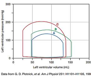 The following graph shows left ventricular pressure-volume curves in one individual. Curve A is the person sitting at rest. Curve B shows the person’s cardiac response to mild exercise on a stationary bicycle. Curve C shows the cardiac response during maximum intensity cycling.